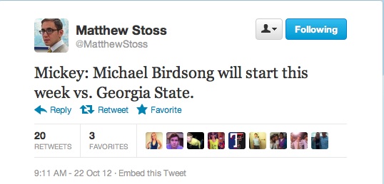 Well, this sort of makes my earlier post defending Thorpe a bit irrelevant, no? Mickey indicated that Thorpes’ failure to pitch the ball on 4th and one was the “straw that broke the camel’s back”. That makes me think this was brewing under the surface for weeks or maybe even longer. It also makes me wonder why we stuck with an offense our QB couldn’t be trusted to run (or vice versa) for so long, but that’s probably something more suited to be discussed over a few beers than in a blog post. In any case, Birdsong has looked good and clearly has talent. If he’s the guy, then we’re behind him. Let’s go Ginger Giant!